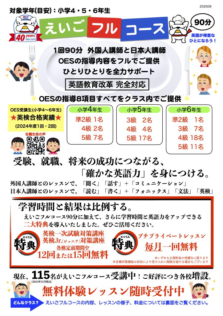 僕は1年生からOESに入りました。そして、4年生でえいごフルコースをはじめました。英語の先生は優しいので接しやすいのですぐに覚えられました。僕は中学生になるまでに英検2級を合格したいです。