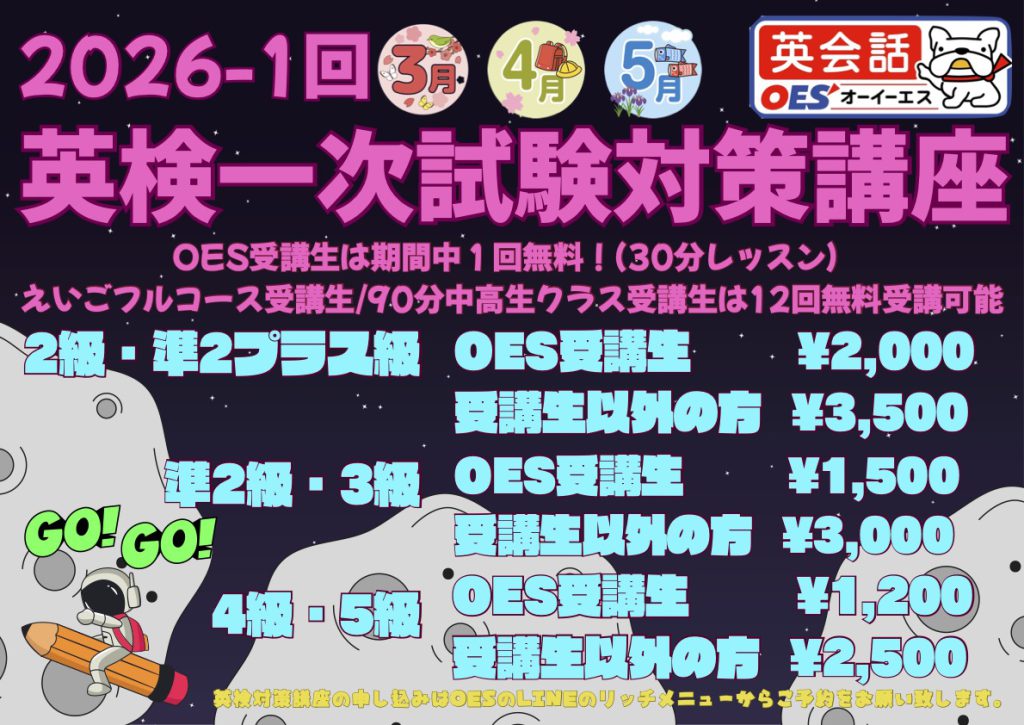 英検一次試験✏️対策講座(3月4月5月)📄の申込受付を3/19(木)14:00から開始致します😀✨
